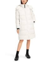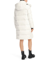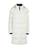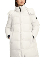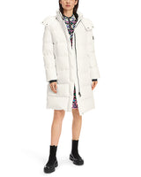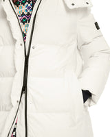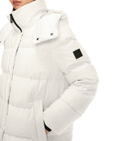 Introducing our White Quilt 3/4 Length Coat, the ultimate statement piece for winter. Stay warm and stylish with its sporty contrast black two-way zip, logo details, and welt cuffs. The detachable hood and soft padding provide added comfort, while the straight cut and 3/4 length exude luxury sportswear. Upgrade your outerwear game with this exclusive coat.
