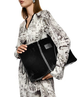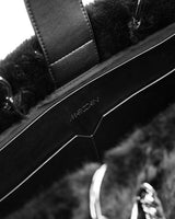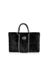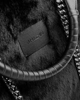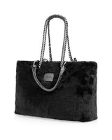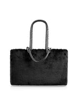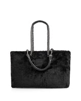 This super fun faux fur shopper combines cozy softness with edgy style, featuring chic silver chain shoulder straps and a plaited leather handle for extra flair. The jet black faux fur is very luxurious. Perfectly sized to hold all your essentials, it also includes handy internal pockets to keep you organised and stylish.
