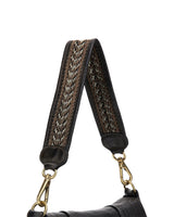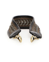 Decorated shoulder bag strap featuring weaved ribbon and raffia, shoulder length strap is made from garment-dyed natural cowhide leather. Made in Italy.
