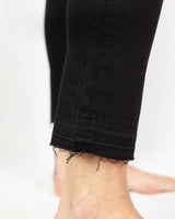 Black cropped skinny jean with frayed ankle hem in fine stretch denim. Five pocket design with tonal rivets and button plus embossed A on right back pocket.