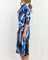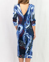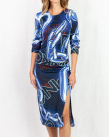 Bold chain print stretch jersey dress with extended shoulders featuring light padding. Low v shaped back with centre back seam. Below knee length with left leg thigh split.