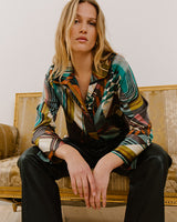 Sophisticated and exclusive, the Janet Silk Blouse features a stunning remarkable art deco print, an open neckline with a half placket, and a soft collar in luxurious stretch silk. The elegant drape and wide cropped sleeves with deep cuffs add a touch of effortless glamour to any outfit.