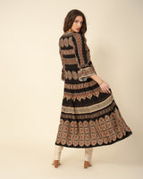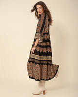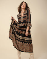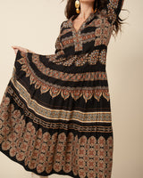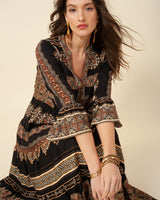 This bohemian style midi dress features a striking print. The print is beautifully placed on the neckline and 3/4 sleeve. The tiered skirt is also decorated with this unique print complimenting our copper, caramel and honey tones for the season.