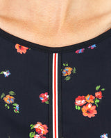 Floral print top with round neck and contrast plain outer sleeve featuring braid down the centre front and sleeve. Welt waistband sits on hip also featuring welt cuff.