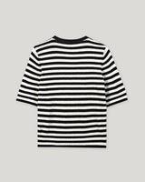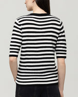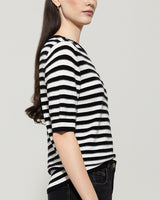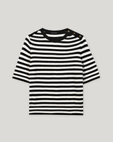 Embrace Parisian flair with this chic black and white striped sweater, perfectly tailored for a neat, flattering fit. Featuring playful gold buttons on the shoulders, it adds a dash of glamour to your everyday look. The cropped sleeves and classic crew neckline keep things effortlessly stylish and fun.