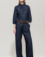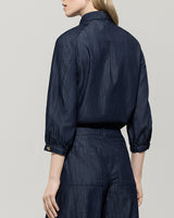 This soft chambray blouse is charming with its cropped sleeves and tie feature. The relaxed fit and curved hem keep things feminine, while gold buttons add an edge. Pair it with our wide chambray pants for a fashion forward outfit.