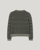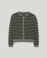Stylish khaki and black striped cardigan, crafted from a soft cashmere blend. Featuring a neat shape and charming decorative gold buttons, it adds a touch of casual luxury to any outfit. Twin with matching sweater for an effortless on trend look with a wide pant.