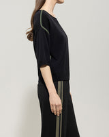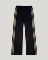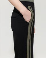These wide-leg luxury punto milano jersey pants bring effortless style to your everyday wardrobe. Featuring bold khaki side stripes, handy pockets, and a cool press stud detail at the ankle, they add a playful twist to comfortable wear. Pair them with matching knitwear for a chic, coordinated look that’s so easy to wear. Perfect for stepping out in style without sacrificing comfort!
