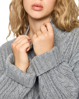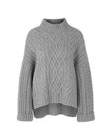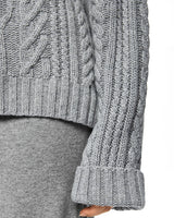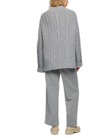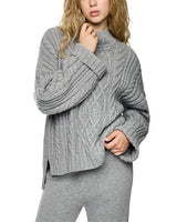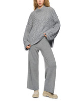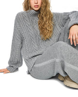 Snuggle up in style with this two-piece cashmere set! The soft grey cable knit sweater comes oversized with wide sleeves and charming turn-back cuffs, while the coordinating pants boast a fun subtle lurex stripe and comfy drawstring waist. It's the perfect cozy-chic outfit option for your weekend wardrobe.