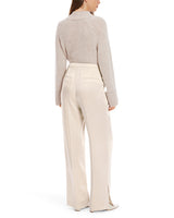 The Satin Oyster Pant is a luxurious and sophisticated choice. With its elegant wide fit and modern split ankle feature, these trousers offer both comfort and style. The oyster colour adds a touch of luxury and pairs perfectly with our cream outerwear and layering pieces, creating a stylish and exclusive outfit.