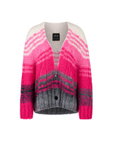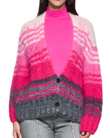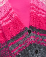 Wrap yourself in color and comfort with this playful mohair cardigan. Its loose, cocoon shape drapes effortlessly, while bold ombre stripes in grey and hot pink add a fun pop to your outfit. Two simple buttons make it easy to wear and perfect for layering on chilly days with a relaxed, happy vibe.