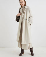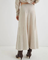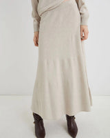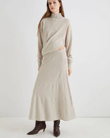 This luxurious knit set combines a twisted asymmetric sweater with a flowing long A-line skirt in an elegant neutral tone. The stylish silhouette pairs perfectly with boots, offering a fashion-forward look that's comfortably chic—ideal for turning everyday wear into a style statement.