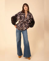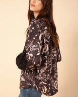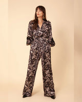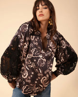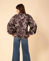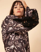 This stunning blouse in Black, Cream & Tan print features a gorgeous macrame lace inset sleeve. The volume sleeve has a smocked cuff and small frill shoulder. The front yoke also features a ladder lace inset and flattering v shaped collarless neckline. The blouse has a coordinating wide leg print pant to create a gorgeous outfit together.