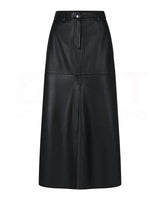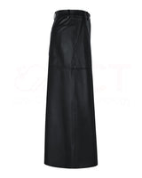 This long leather skirt brings versatile style with its stretchy fit and front split, perfect at midi length. Dress it up with a chic blouse and heels or keep it casual with a cozy knit and boots. A fabulous piece that moves with you from day to night, adding edge and elegance to any outfit.