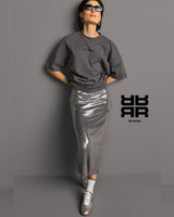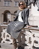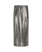 Add a sparkle to your party look with this dazzling metallic skirt. Perfectly stretchy for comfort, it pairs effortlessly with a chic shirt roll neck or a chunky knit, giving you a modern and more relaxed vibe if you choose. Whether you're dancing the night away or catching up with friends, this show-stopper keeps you stylish and comfy all evening long.