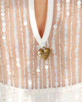 Long sleeve straight fit top with hand-embroidered sequin and crystal beads stripes. Round neck with teardrop opening at the back featuring single button closure and heart pendant. Matching crepe de chine slip included.