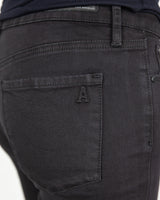 Mid rise classic full length skinny stretch cotton denim jean. Five pocket design with tonal rivets and button with embossed A on right pocket.